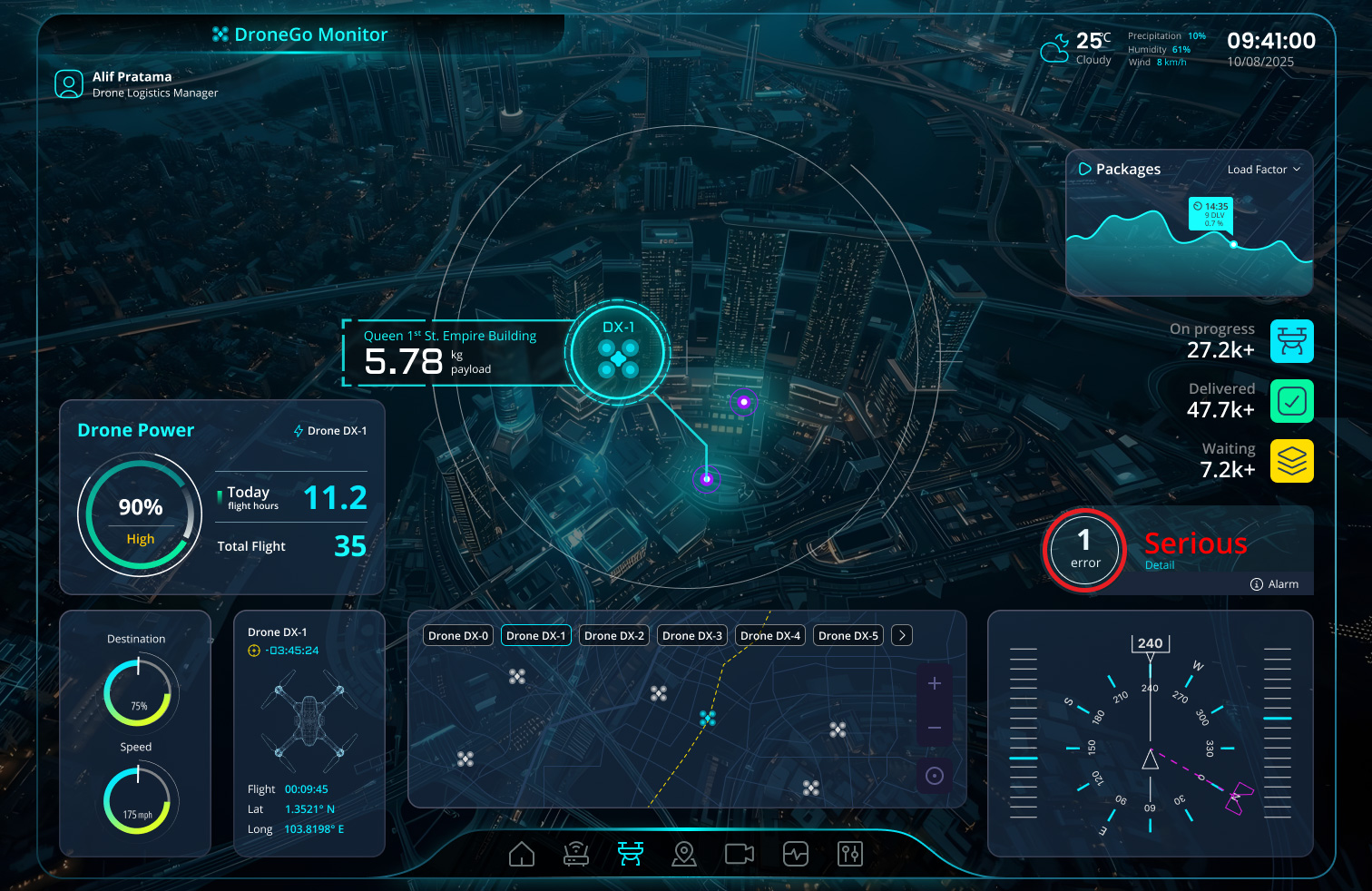 DroneGo Monitor is a next-generation control interface designed for companies managing large-scale drone delivery systems. As global logistics shifts toward automation, the ability to track, predict, and control drone fleets in real-time becomes mission-critical.